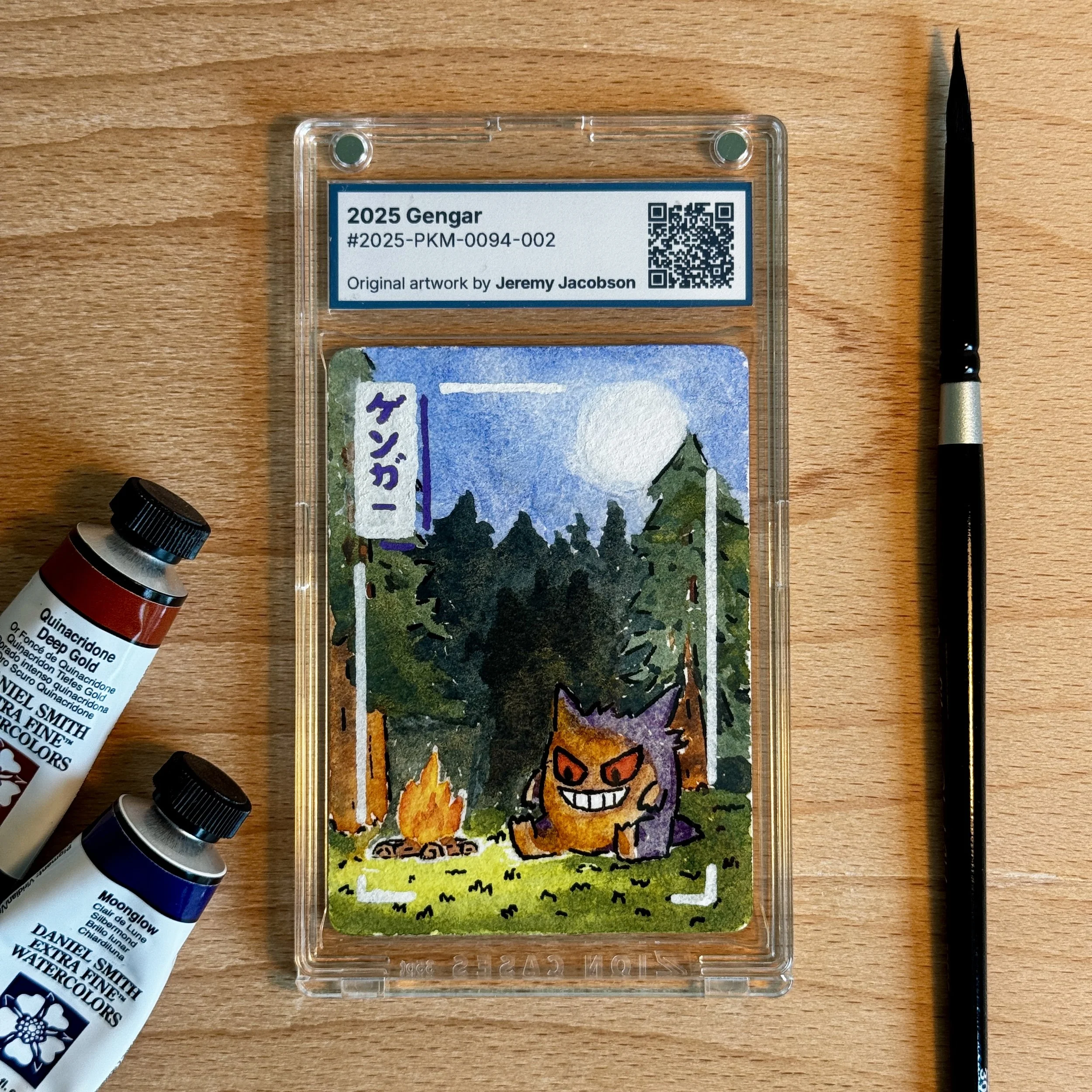 Gengar Pokémon trading card with original artwork in watercolor and acrylic medium.