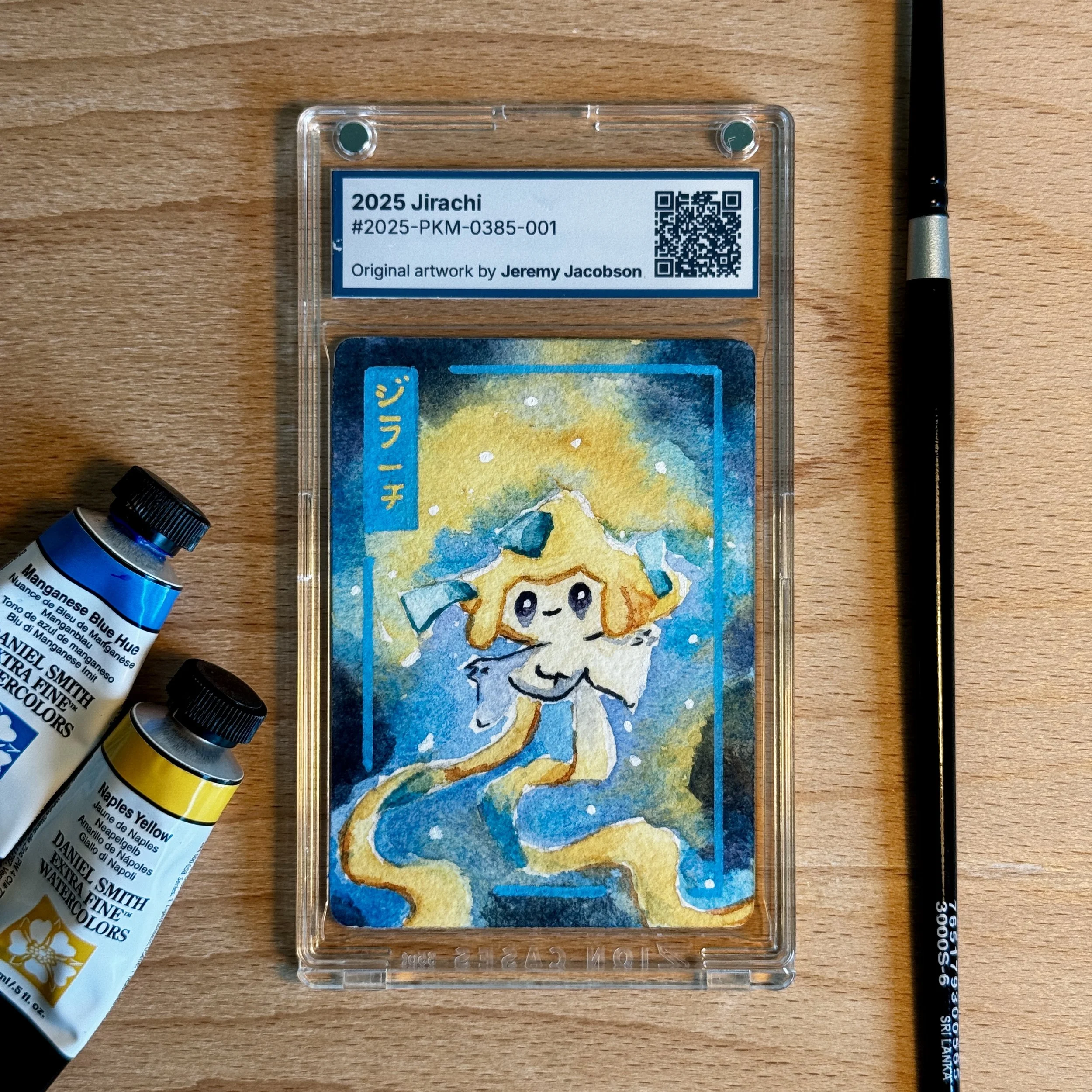 Jirachi Pokémon trading card with original artwork in watercolor and acrylic medium.