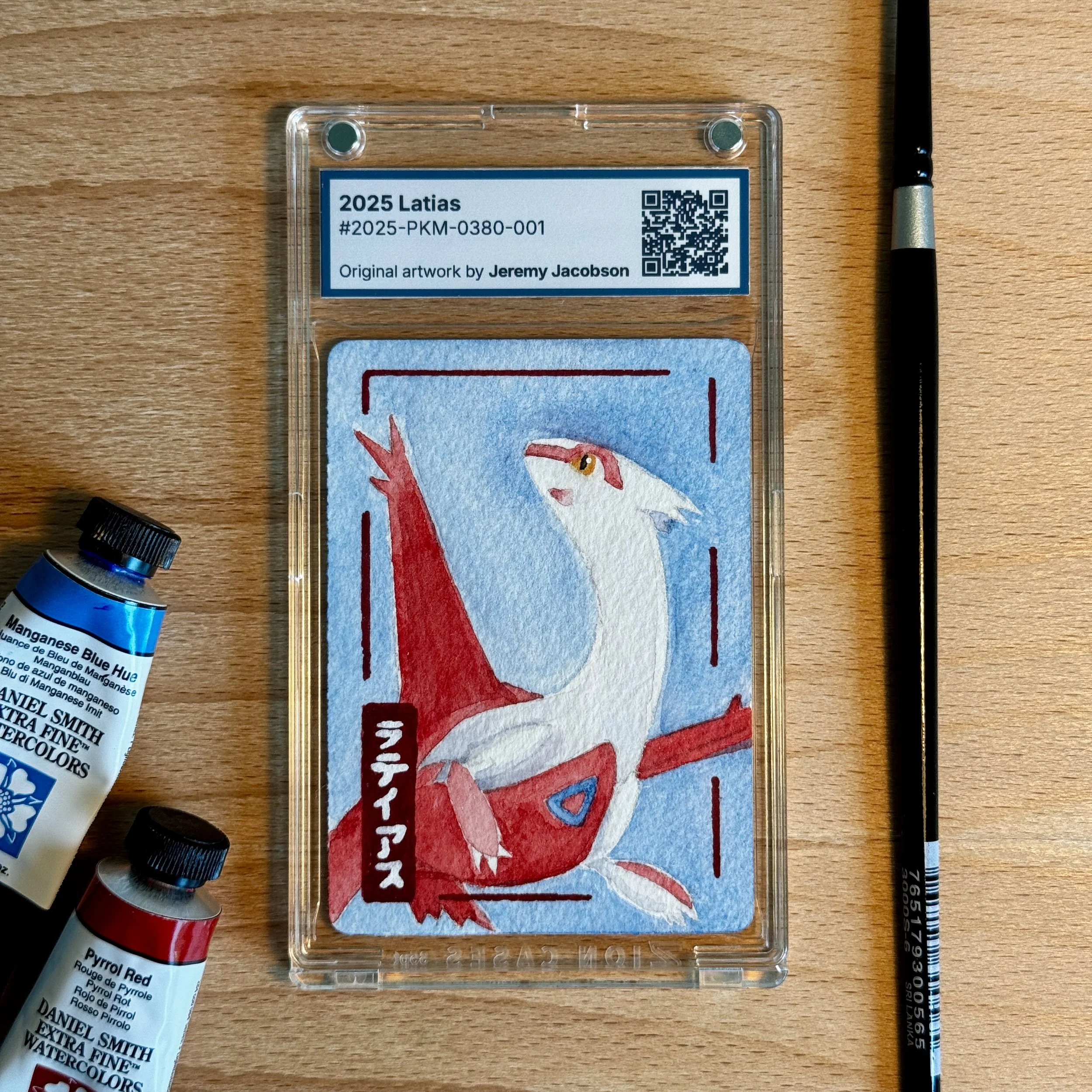 Latias Pokémon trading card with original artwork in watercolor and acrylic medium.