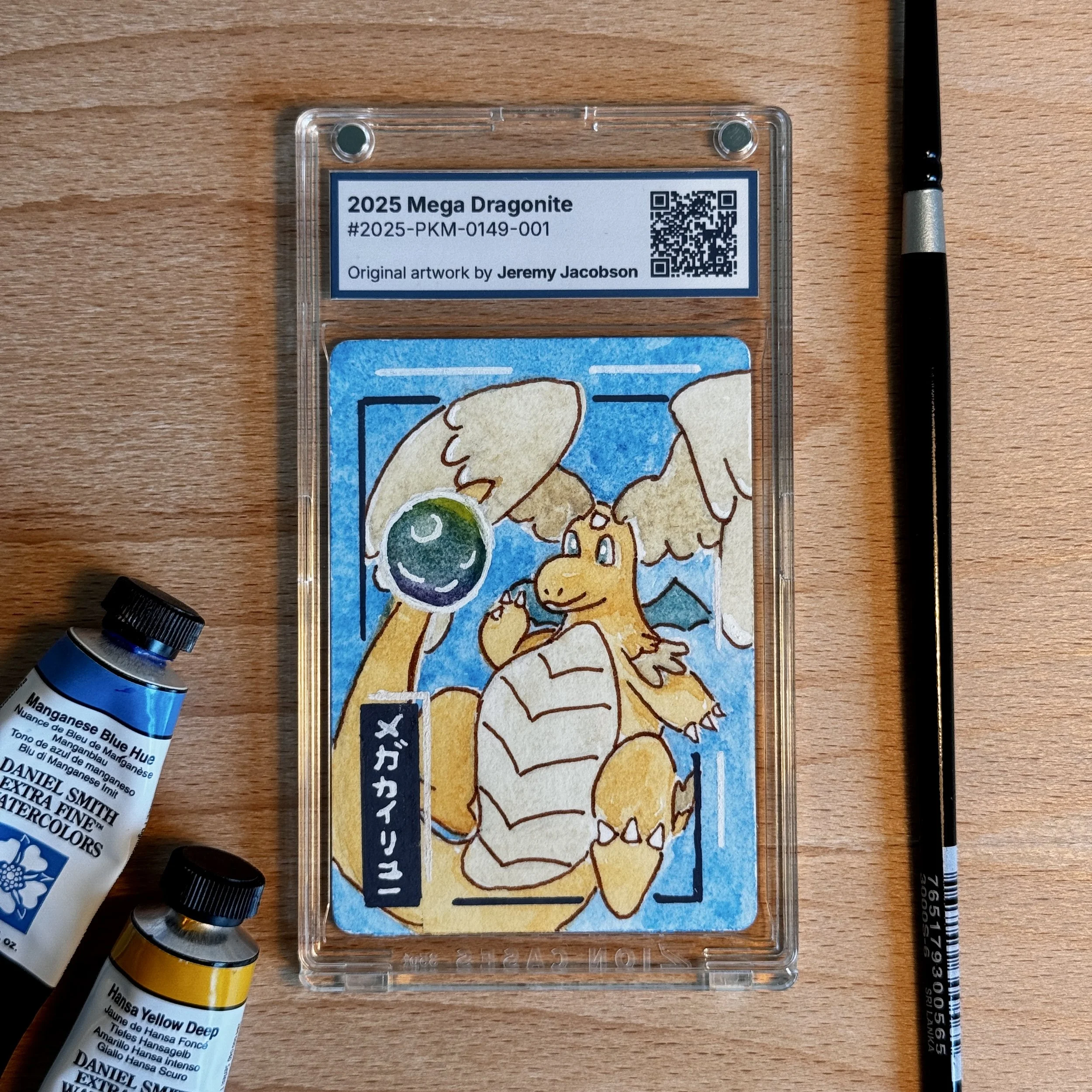 Mega Dragonite Pokémon trading card with original artwork in watercolor and acrylic medium.