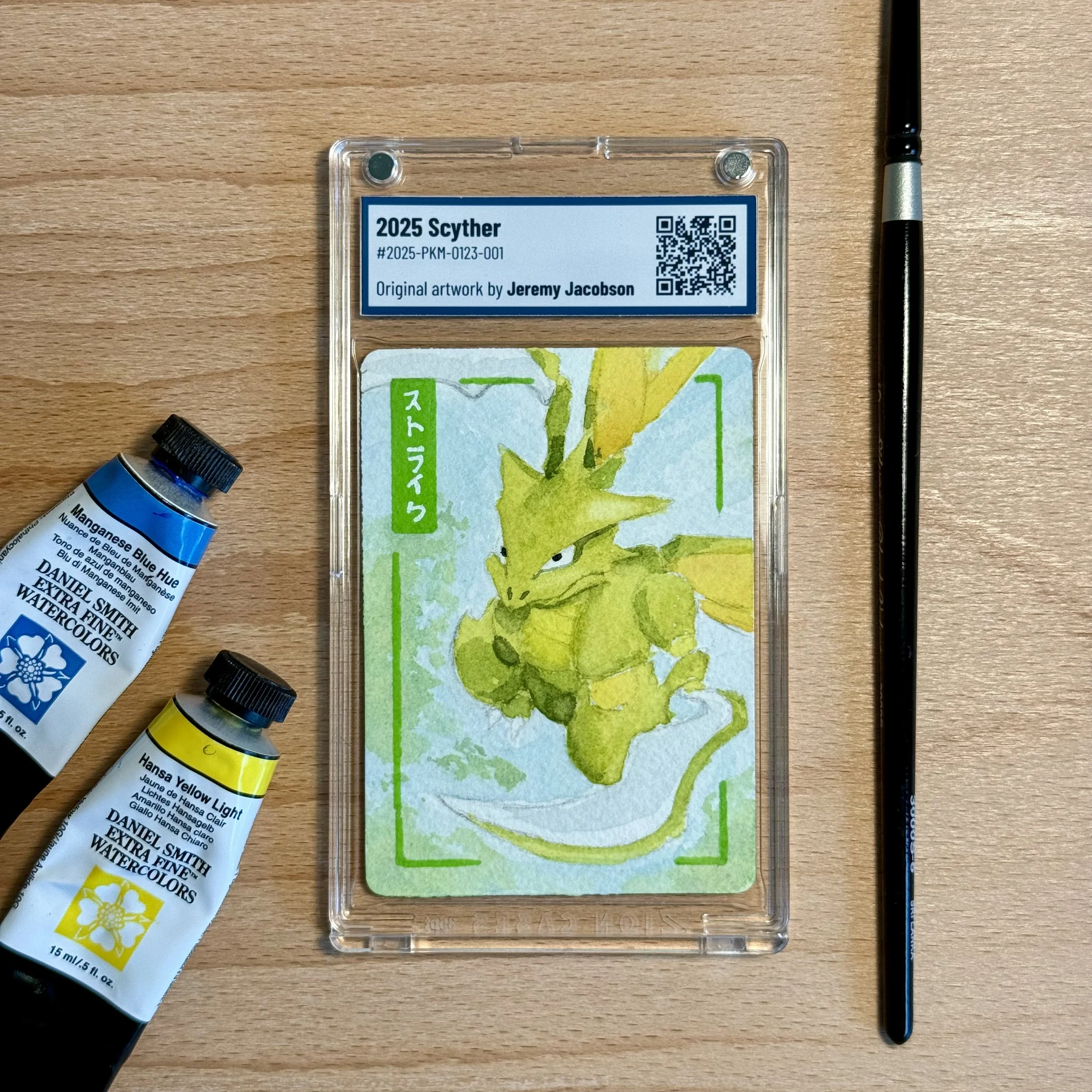 Scyther Pokémon trading card with original artwork in watercolor and acrylic medium.